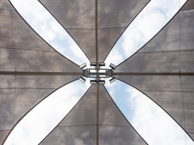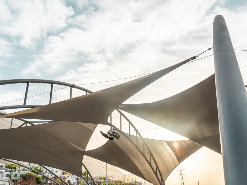 Cubierta tipo velaria, con armaduras tipo tenso-estructura, con perfiles oc de acero A-500º B Diferentes diámetros, cubriendo un claro de 40 metros, cubierta a base de malla sombra importada comercial 95.